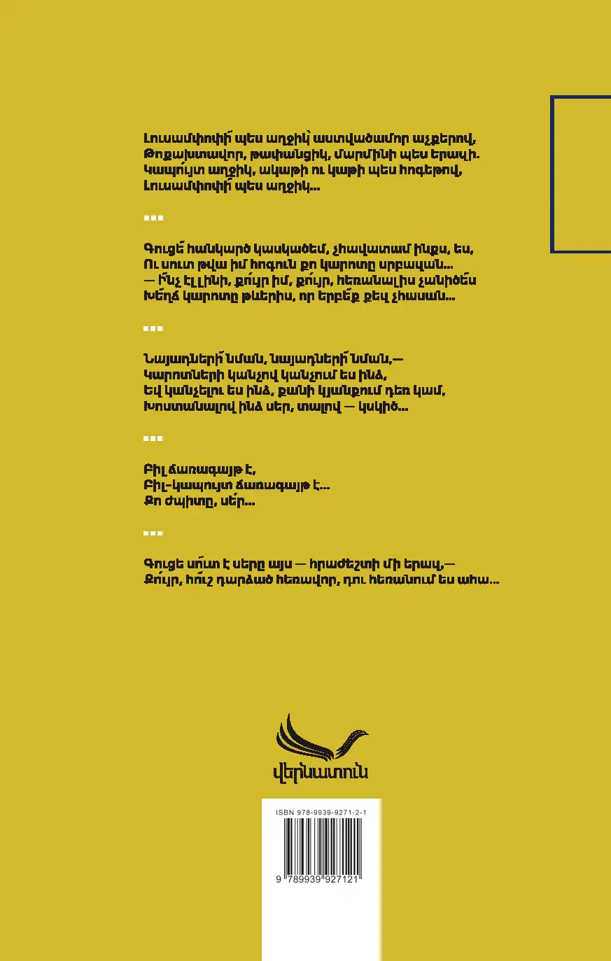 From “The Blue Girl” to the unattainable symbol of love Navzike, from the first luminous love to “The Street Courtesan”… Charents’ poetry, lived with a stormy life, is full of countless loves, each reflected in his texts as the poet’s heart’s turbulences. Although there are dozens of collections of Charents’ works, this selection of his love writings is being published for the first time. The poems in the book are arranged in chronological order. “Girl Like a Lampshade” presents the full variety of Charents’ metric, genre, and stylistic range. This volume of the great poet’s personal experiences can serve as a wonderful confession of love for anyone.